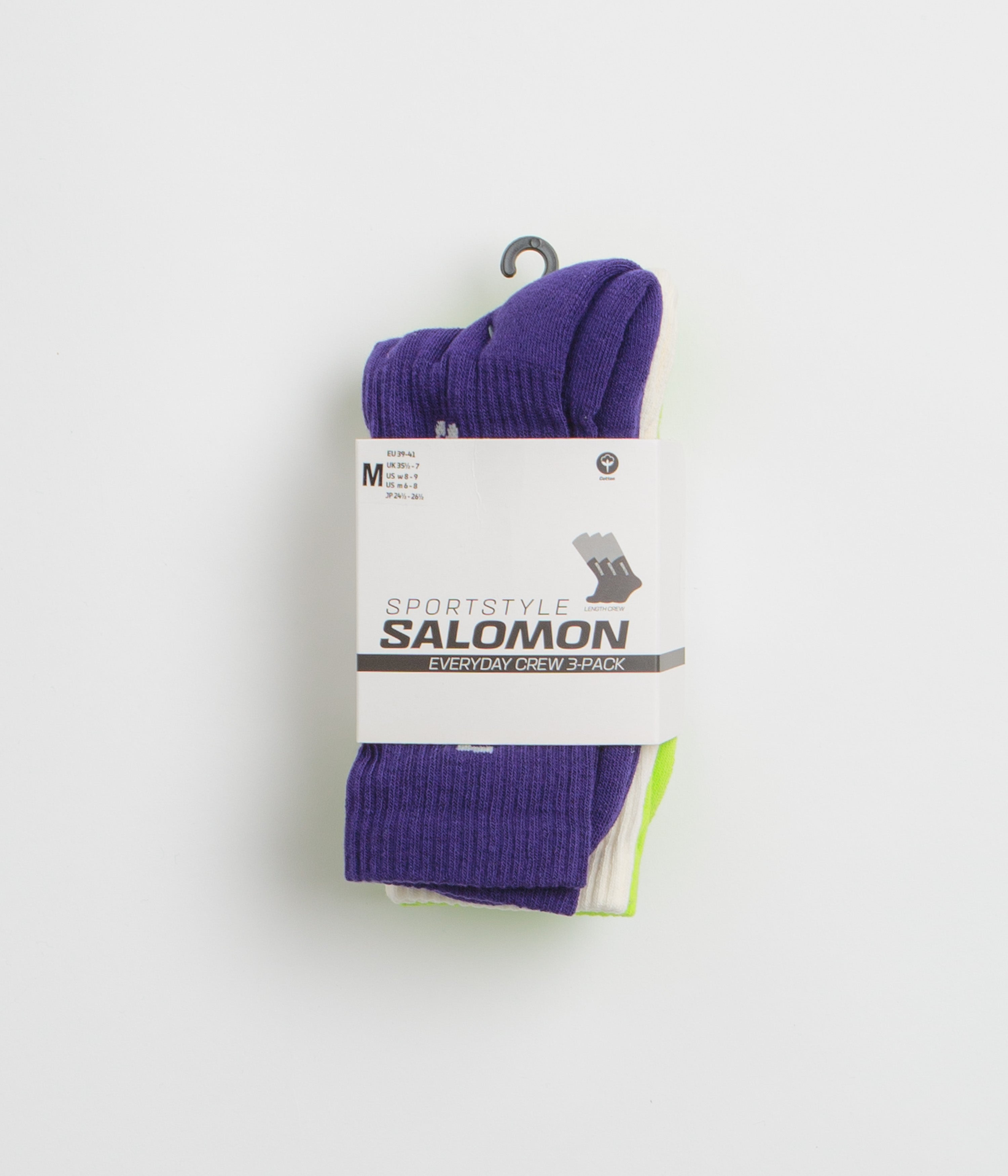 Crew-length and built for every session, these Salomon socks mix cotton with polyamide for stretch and comfort that moves with you. Reinforced heels, loop-stitch cushioning, and elastic arch support keep them working as hard as you do, while ribbed cuffs and subtle jacquard logos give a sleek finish.